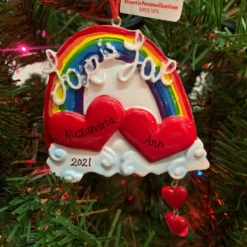 Celebrate LOVE with our personalized love is love ornament! This ornament features two hearts sitting on a cloud with a rainbow in the background and a few hearts dangling below! Get two names and the date written for a wonderful keepsake! Made by Kurt Adler. Made of resin. Dimensions: 5″ x 3.75″. Item #: W8454