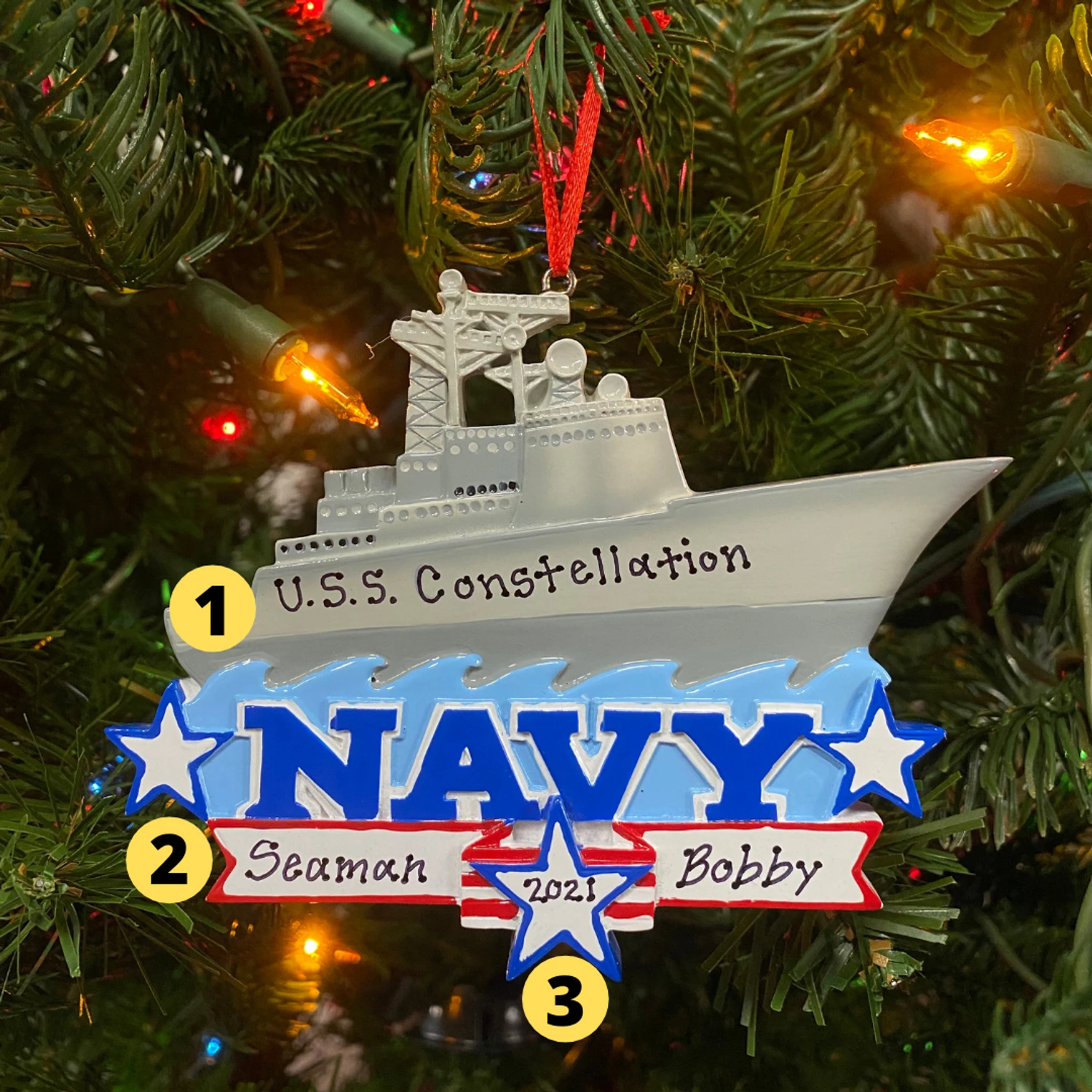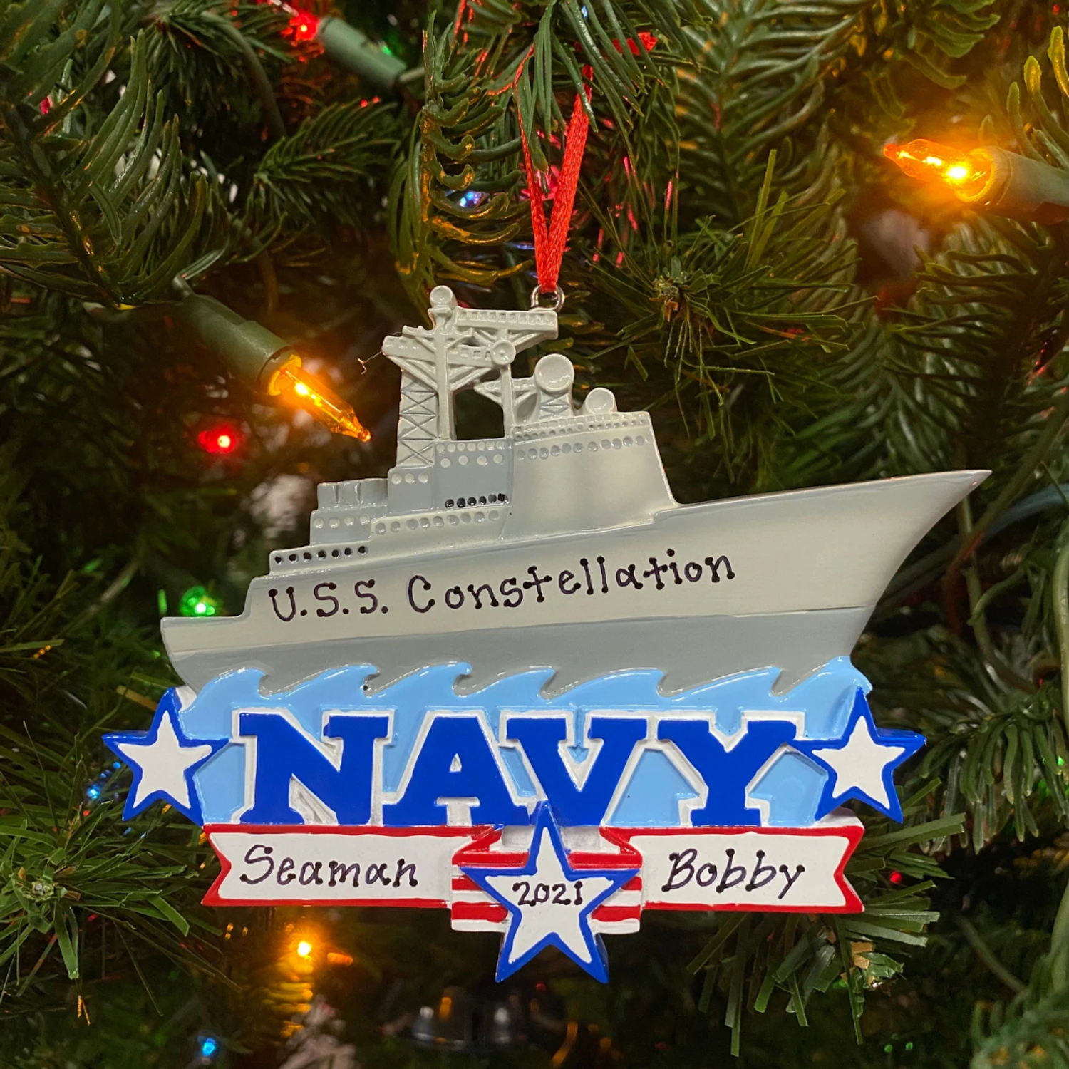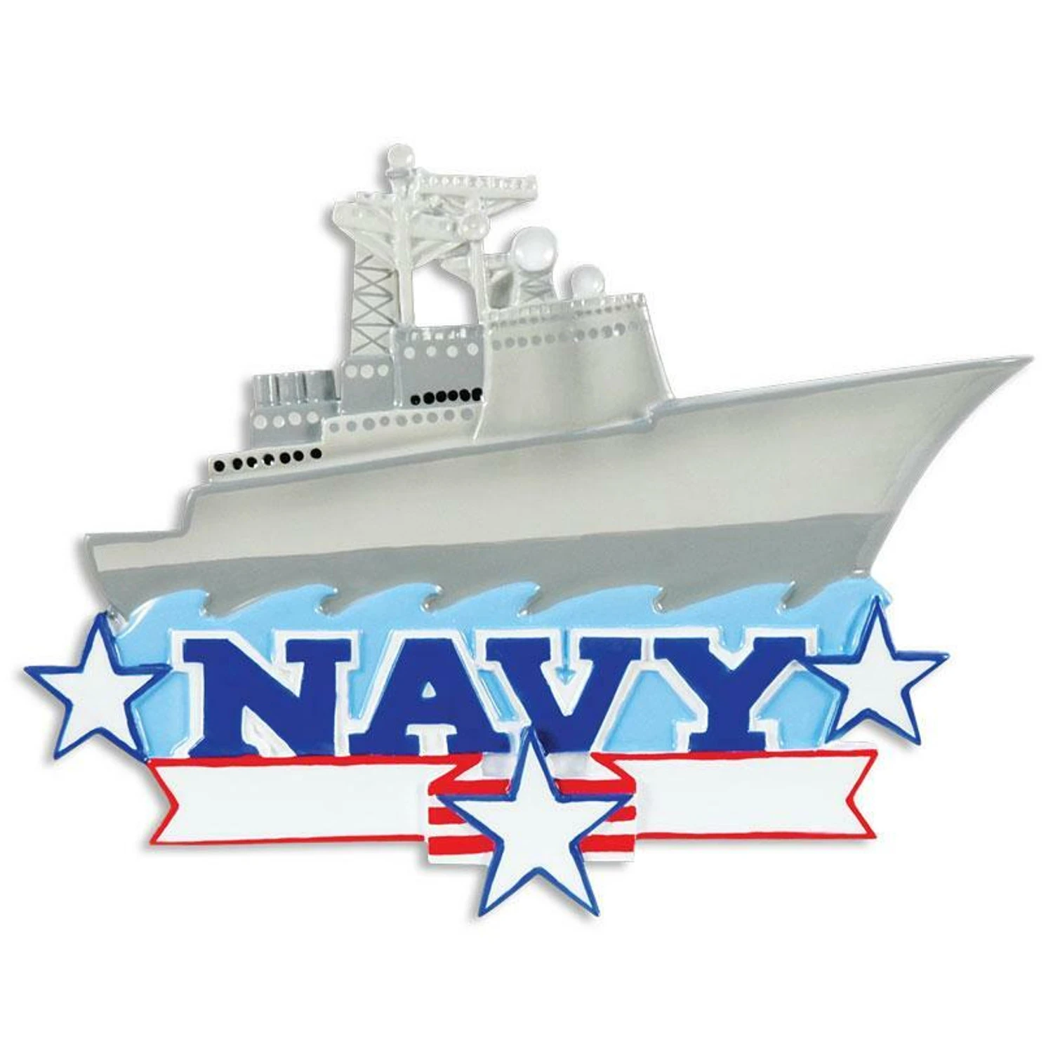 Celebrate your loved ones that dedicate their lives to our country with this awesome ornament! It features a sleek silver Navy ship on the water with a banner at the bottom to put your name and the year! Made of resin. Dimensions: 5″ x 3.75″. Item #: OR1394