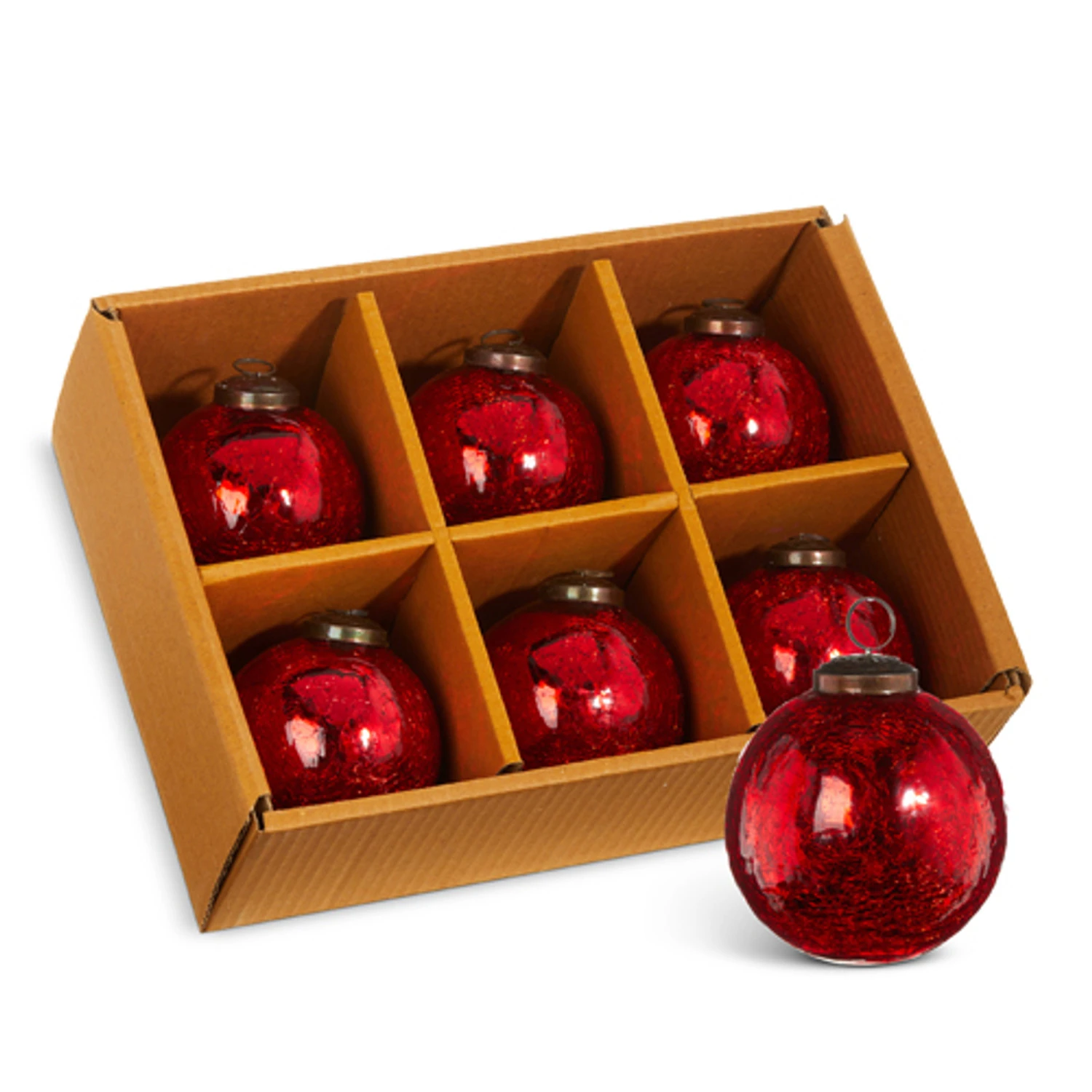Adorn your tree with these gorgeous red glass ornaments that have a unique crackle effect to them with a sturdy topper to hang them on your tree! Made by Raz Imports. Made of glass. Dimensions: each ornament is 3.5″ and comes in a box of 6. Item #: 4300714Â
