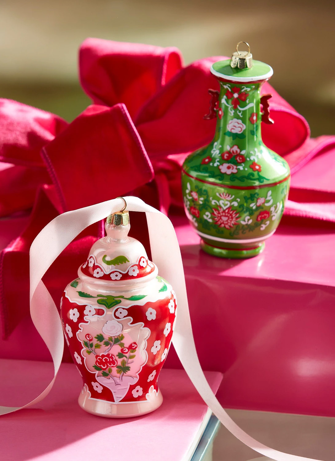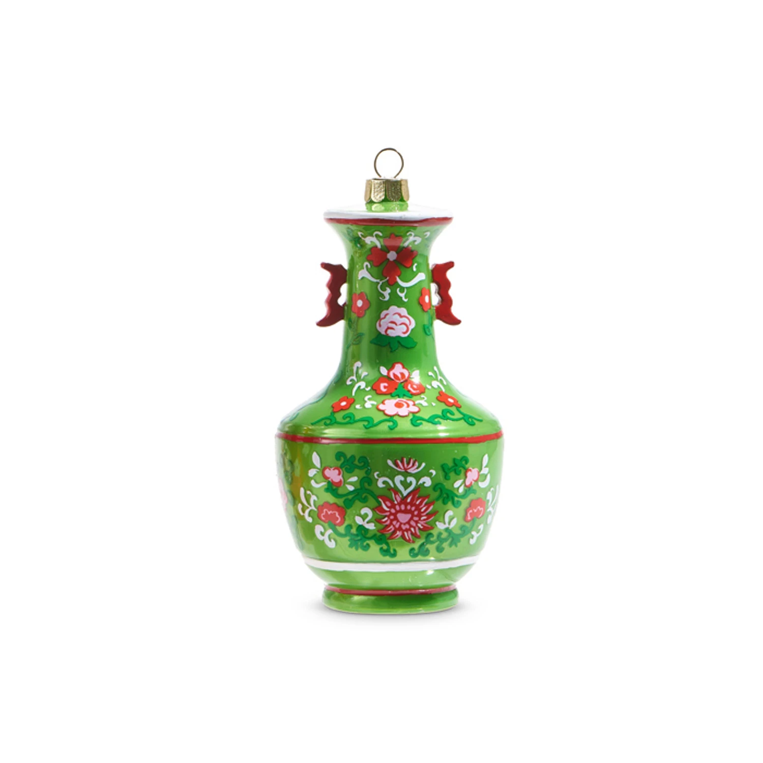 These stunning ornaments feature a unique glass vase shape decorated with a gorgeous floral design made up of tiny roses, greenery, swirls, and small flowers! Each sold individually OR as a set of 2. Made by Raz Imports. Made of glass and resin. Dimensions: 3″D X 5″H. Item #: 4352888