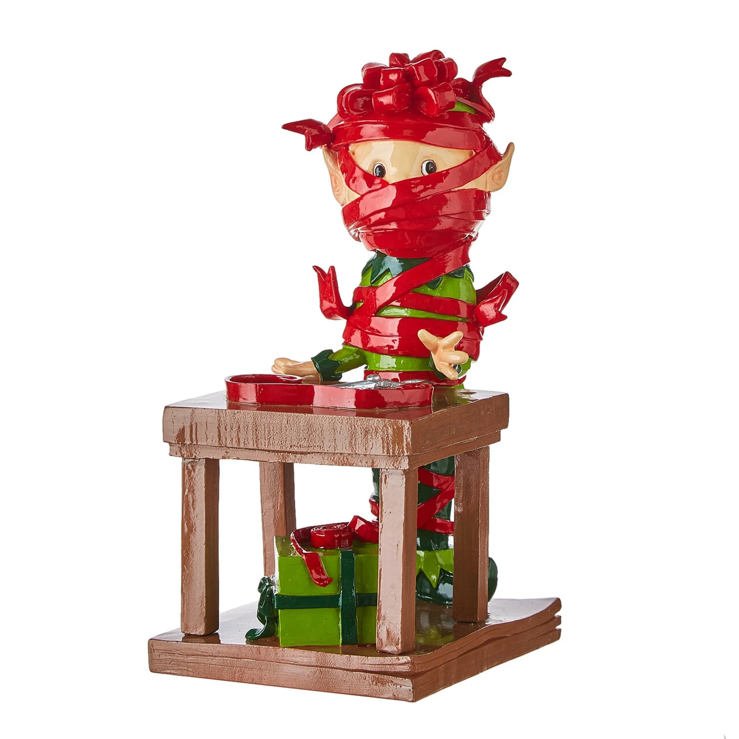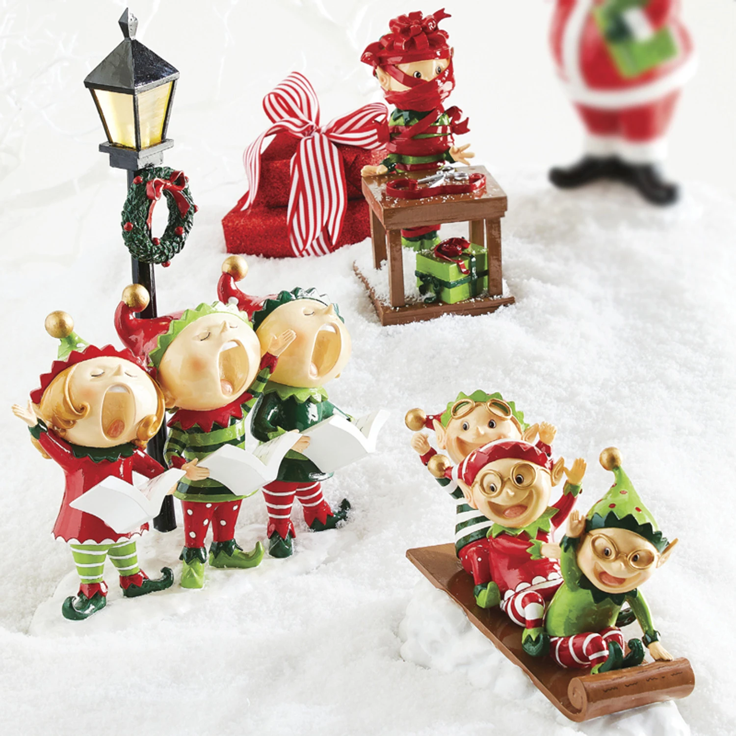 Today at the Elf University there’s a lot going on! One elf looks like he needs a bit more practice with wrapping gifts. He’s all wrapped up in bright red ribbon with a bow on his head- you can barely see his green elf outfit popping through the ribbon tangled around him! Another trio of elves excitedly slide down a snowy slope with giant smiles on their faces! And a few stand under a street light practicing their caroling skills. Each of these figures have bright red and green outfits sure to stand out in your decor this year! Each sold individually. Made by Raz Imports. Made of resin. Dimensions: 4″ L x 6″ W x 8.5″ H. Item #: 4110253 4110255 4110256
