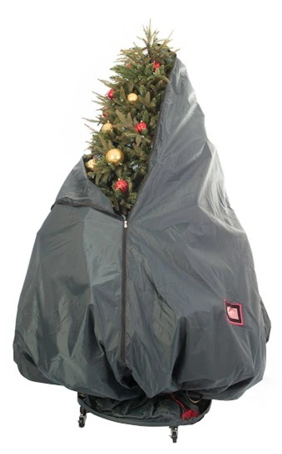 The tree is decorated so beautifully, every ornament in the perfect spot, the lighting just so. Have you ever wished you could just bundle up the tree, fully decorated, and put it away for next year without packing or unpacking a thing? Well, wishes can come true with this Treekeeper Pro Decorated Tree Storage Bag with a Rolling Stand. Store your fully decorated tree safely in the upright position. The bag attaches to the tree stand and compresses under the skirt, no one will know it is there. Thanks to this rolling tree stand, you can cover and protect your tree and roll right into your Christmas storage space easily. Made by Treekeeper. Made of polyester fabric. Dimensions 65″ x 65″ x 108″ Holds a tree up to 9′ x 70″. One year warranty against manufacturer defects. Item # TK-10104.
